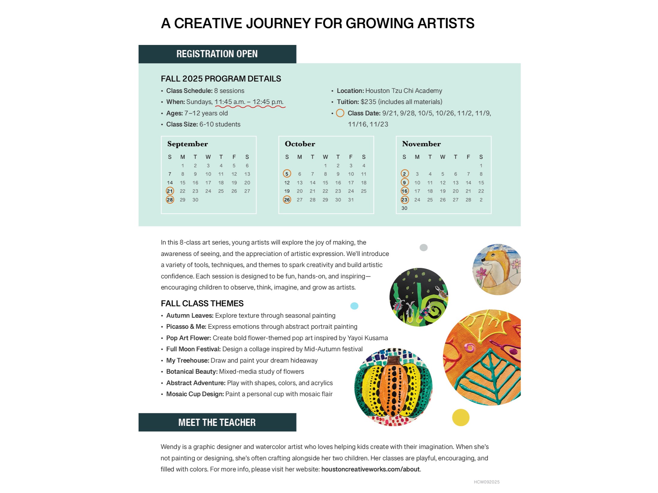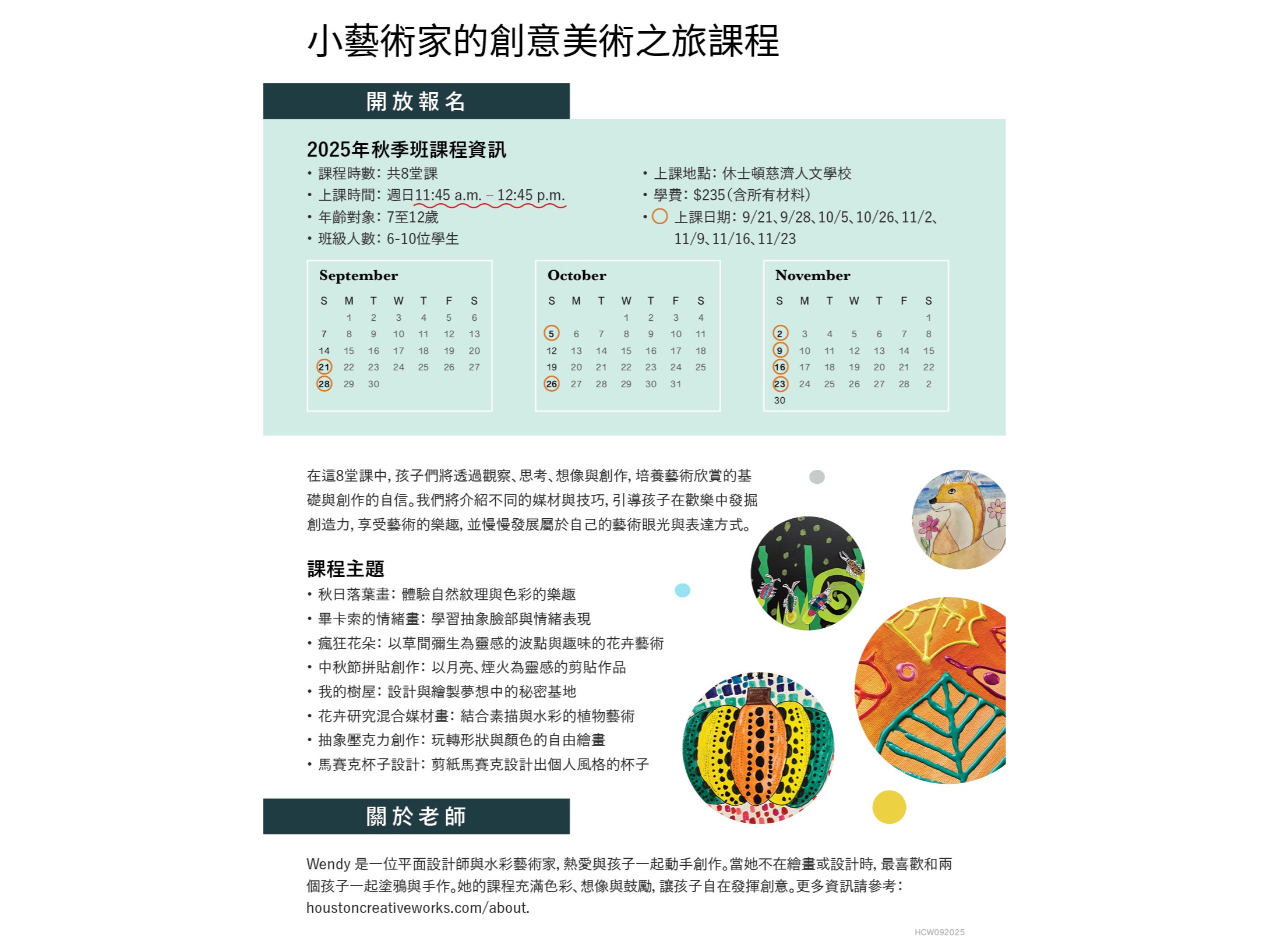 - Dates:9/21, 9/28, 10/5, 10/26, 11/2, 11/9, 11/16, 11/23